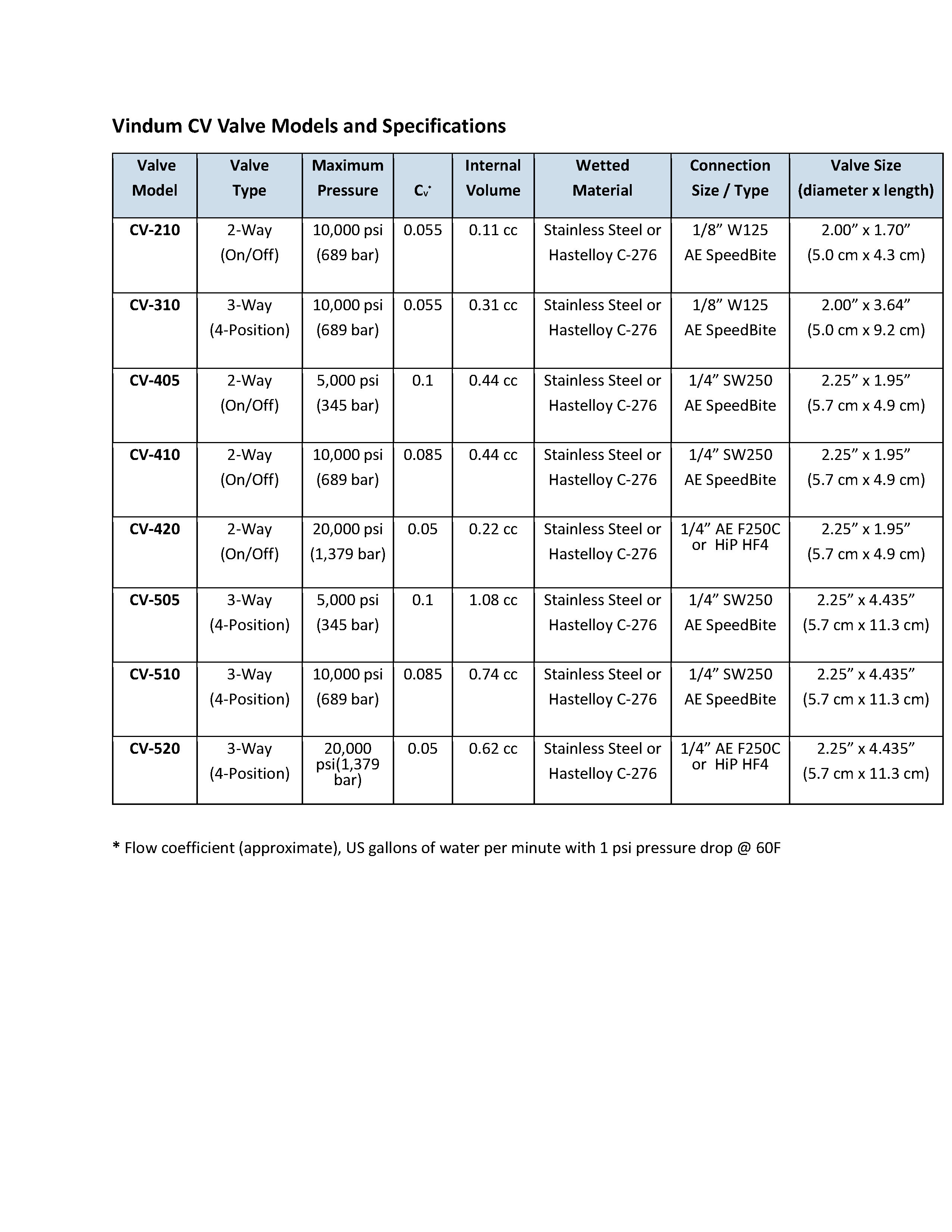 Specifications for Vindum CV-Series valve models are shown in the table below. Click here to Download the PDF Document.